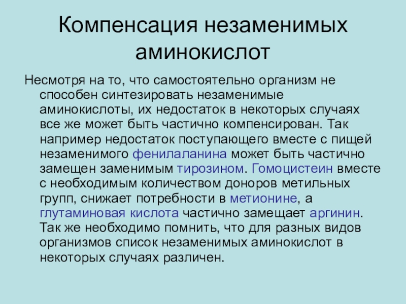 незаменимые аминокислоты, их недостаток в некоторых случаях все же может быть частично компенсирован. Так например недостаток поступающего вместе с пищей незаменимого фенилаланина может быть частично замещен заменимым тирозином. Гомоцистеин вместе с необходимым количеством доноров метильных групп, снижает потребности в метионине, а глутаминовая кислота частично замещает аргинин. Так же необходимо помнить, что для разных видов организмов список незаменимых аминокислот в некоторых случаях различен.