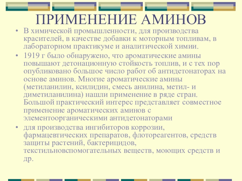 Слайд 12ПРИМЕНЕНИЕ АМИНОВ