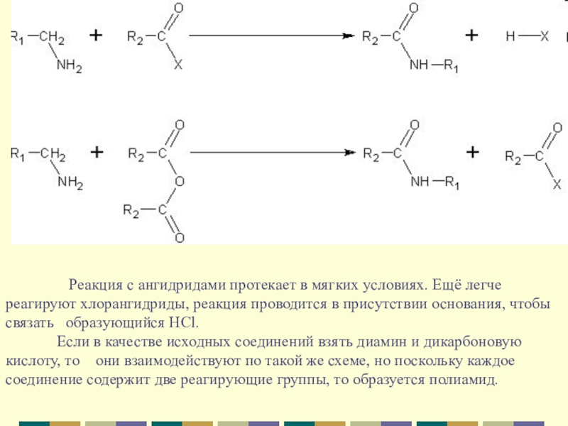 Если в качестве исходных соединений взять диамин и дикарбоновую кислоту, то они взаимодействуют по такой же схеме, но поскольку каждое соединение содержит две реагирующие группы, то образуется полиамид.