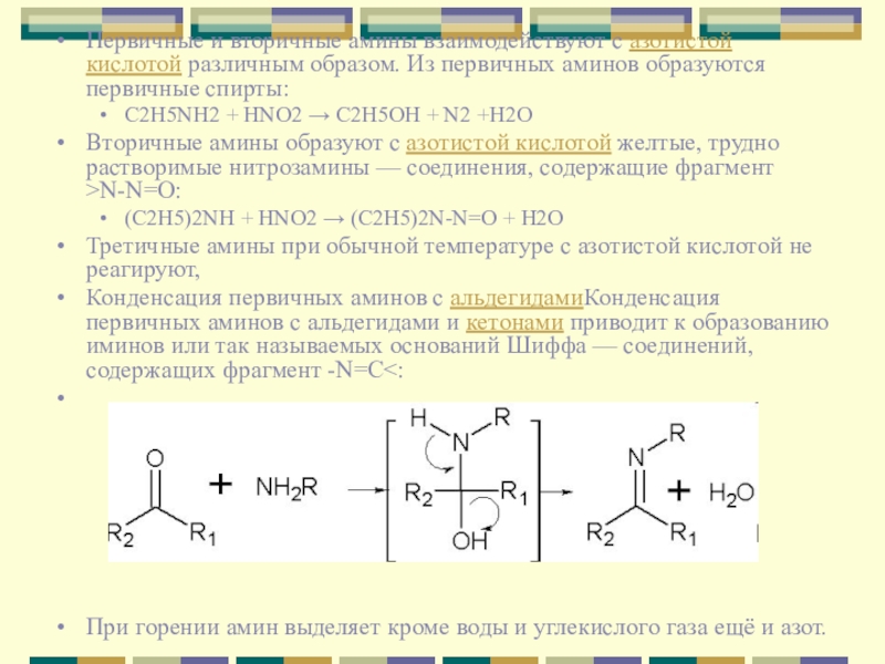 Слайд 8Первичные и вторичные амины взаимодействуют с азотистой кислотой различным образом. Из