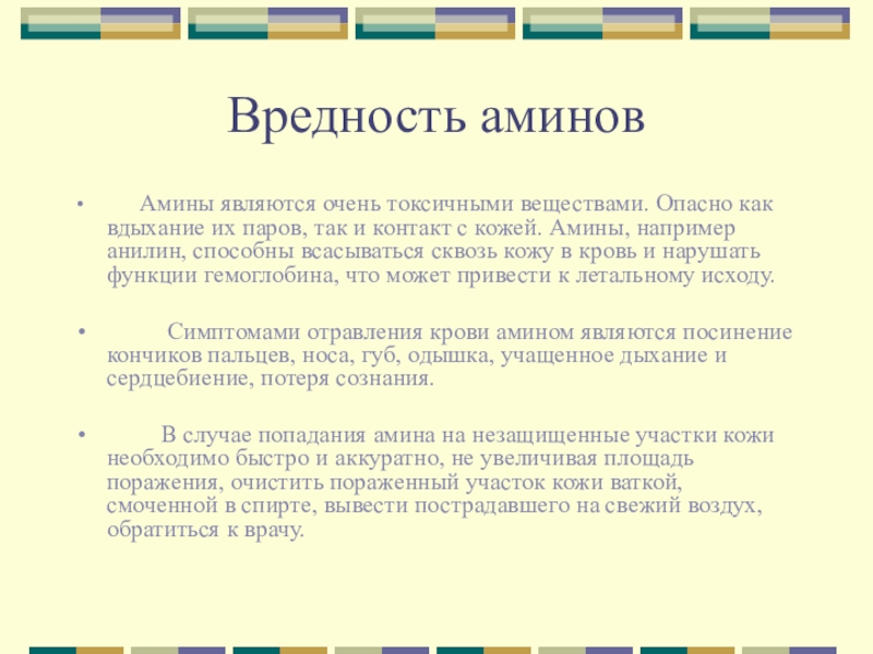 вдыхание их паров, так и контакт с кожей. Амины, например анилин, способны всасываться сквозь кожу в кровь и нарушать функции гемоглобина, что может привести к летальному исходу.