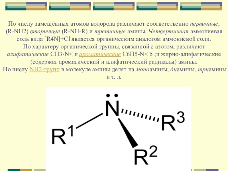 Слайд 3По числу замещённых атомов водорода различают соответственно первичные, (R-NH2) вторичные (R-NH-R)