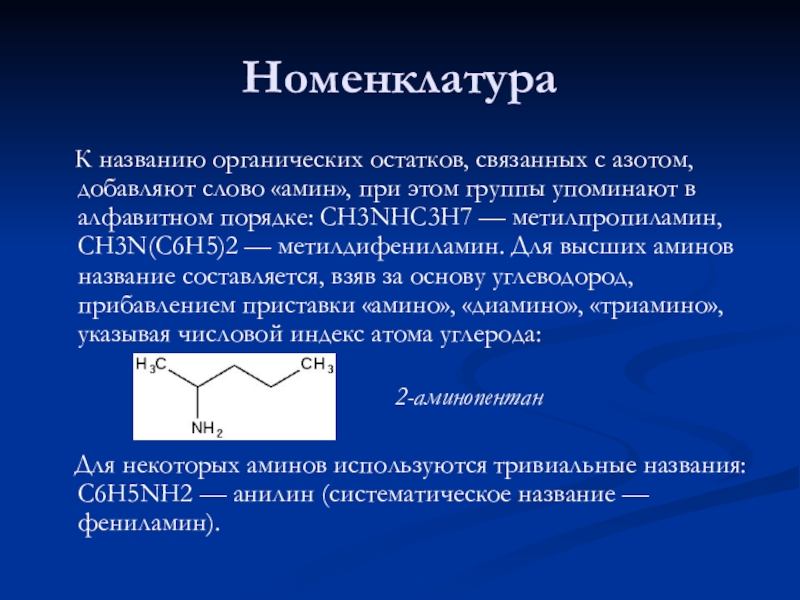 «амин», при этом группы упоминают в алфавитном порядке: CH3NHC3Н7 — метилпропиламин, CH3N(С6Н5)2 — метилдифениламин. Для высших аминов название составляется, взяв за основу углеводород, прибавлением приставки «амино», «диамино», «триамино», указывая числовой индекс атома углерода:
