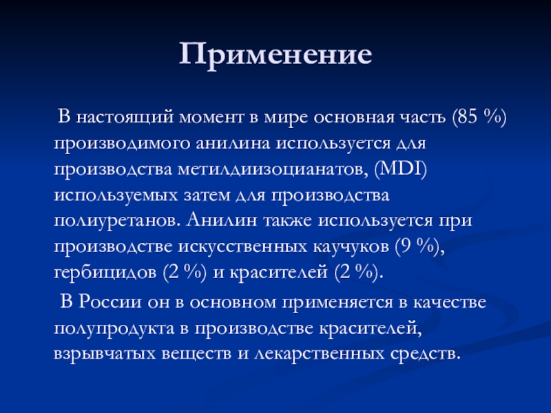 В России он в основном применяется в качестве полупродукта в производстве красителей, взрывчатых веществ и лекарственных средств.