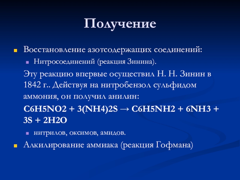 осуществил Н. Н. Зинин в 1842 г.. Действуя на нитробензол сульфидом аммония, он получил анилин: