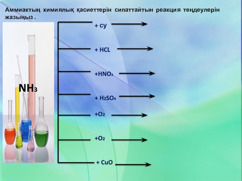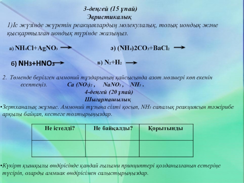 Зертханалық жұмыс. Аммоний тұзына сілті қосып, NH3 сапалық реакциясын тәжірибе арқылы байқап, кестеге толтырыңыздар.