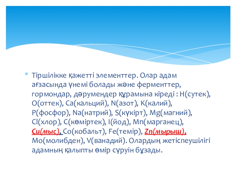 Слайд 2Тіршілікке қажетті элементтер. Олар адам ағзасында үнемі болады және ферменттер, гормондар,