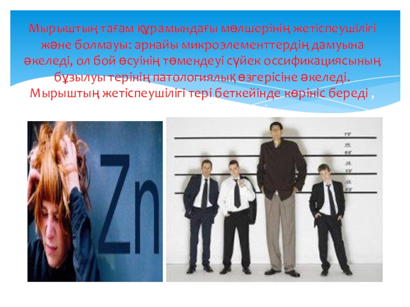 Слайд 9Мырыштың тағам құрамындағы мөлшерінің жетіспеушілігі және болмауы: арнайы микроэлементтердің дамуына әкеледі,