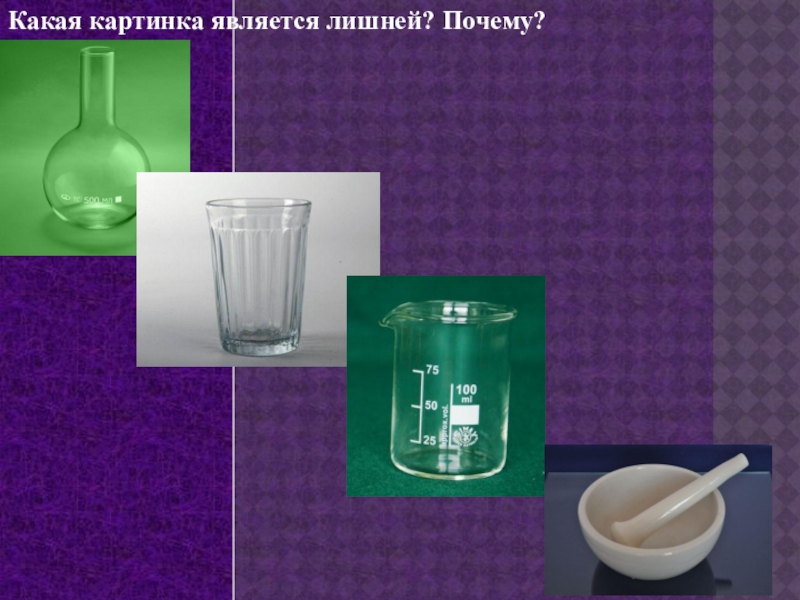 1) Стакан – не химическая посуда 2) Пестик и ступка – не из стекла