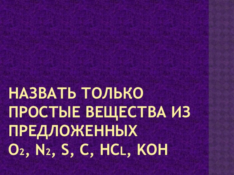 Слайд 9Назвать только простые вещества из предложенных О2, N2, s, c, Hcl, koh