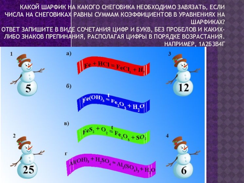 равны суммам коэффициентов в уравнениях на шарфиках? Ответ запишите в виде сочетания цифр и букв, без пробелов и каких-либо знаков препинания, располагая цифры в порядке возрастания. Например, 1а2б3в4г