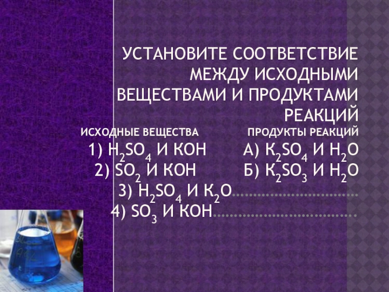 Продукты реакций 1) H2SO4 и КOH A) К2SO4 и H2O 2) SO2 и КOH  Б) К2SO3 и H2O 3) H2SO4 и К2O………………………… 4) SO3 и КOH…………………………….