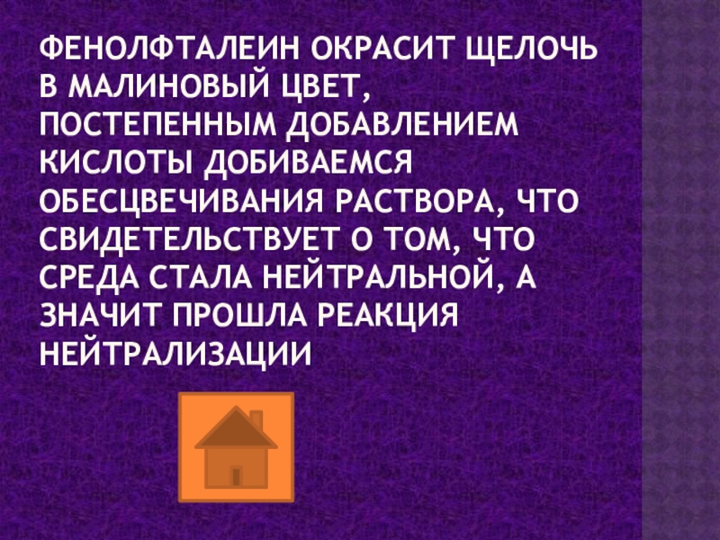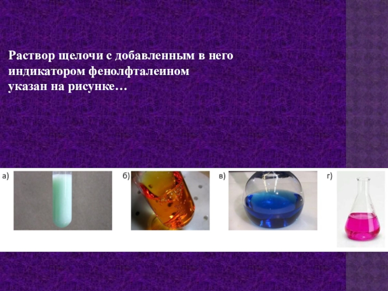 Слайд 46Фенолфталеин окрасит щелочь в малиновый цвет, постепенным добавлением кислоты добиваемся обесцвечивания