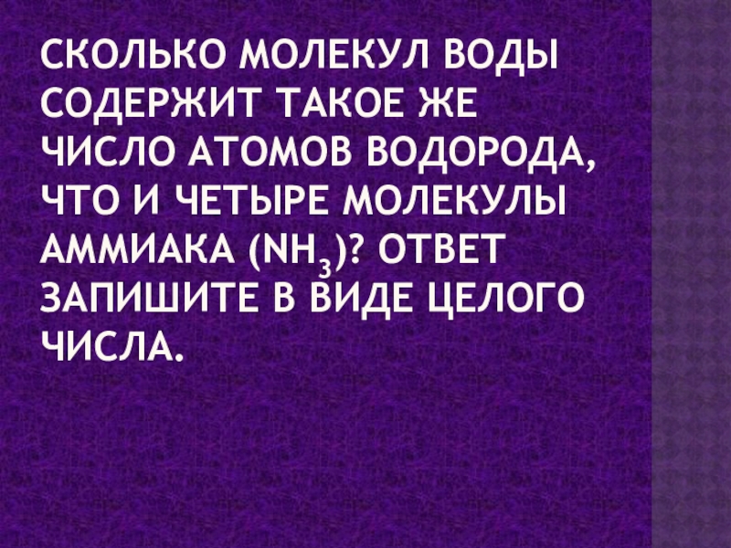 Сколько молекул воды содержит такое же число атомов водорода, что и четыре молекулы аммиака (NH3)? Ответ запишите