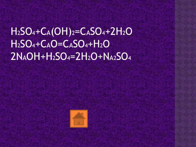 Слайд 32H2SO4+Ca(OH)2=CaSO4+2H2O H2SO4+CaO=CaSO4+H2O 2NaOH+H2SO4=2H2O+Na2SO4
