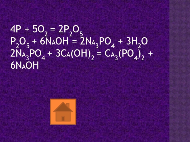 Слайд 284P + 5O2 = 2P2O5 P2O5 + 6NaOH = 2Na3PO4 + 3H2O 2Na3PO4 + 3Ca(OH)2 = Ca3(PO4)2 + 6NaOH