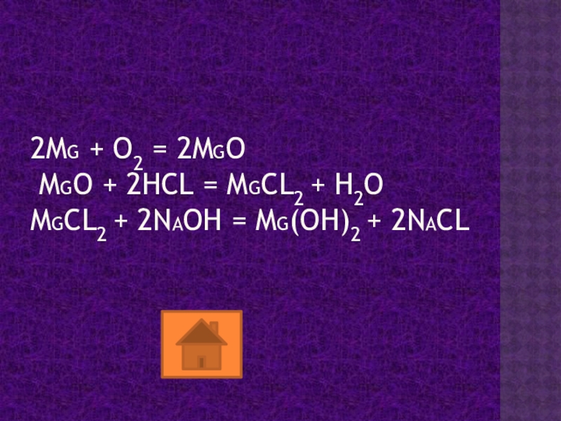 Слайд 302Mg + O2 = 2MgO  MgO + 2HCl = MgCl2 + H2O MgCl2 + 2NaOH = Mg(OH)2 + 2NaCl