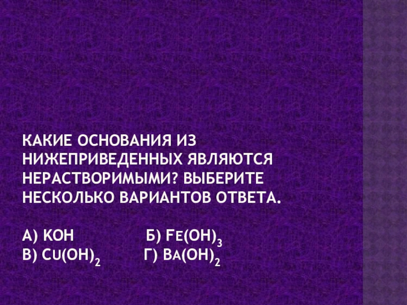 Слайд 17Какие основания из нижеприведенных являются нерастворимыми? Выберите несколько вариантов ответа.   а)