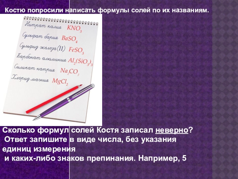 Костю попросили написать формулы солей по их названиям. Сколько формул солей Костя записал неверно? Ответ запишите в