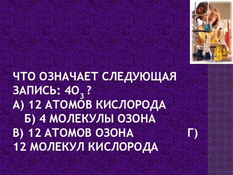 Слайд 21Что означает следующая запись: 4О3 ? А) 12 атомов Кислорода Б) 4 молекулы