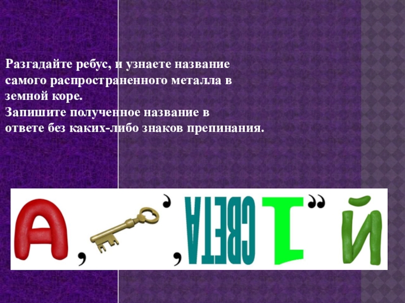 Разгадайте ребус, и узнаете название самого распространенного металла в земной коре.Запишите полученное название в ответе без каких-либо