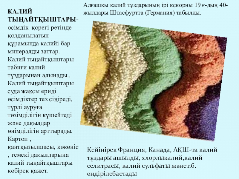 Кейінірек Франция, Канада, АҚШ-та калий тұздары ашылды, хлорлыкалий,калий селитрасы, калий сульфаты жәнет.б. өндірілебастады