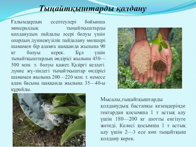 Мысалы,тыңайтқыштарды қолданудың бастапқы кезеңдерінде гектардан қосымша 1 т астық алу үшін 180—200 кг азотты енгізуге жетеді. Келесі қосымша 1 т астық алу үшін 2—3 есе көп тыңайтқыш қолдану керек.