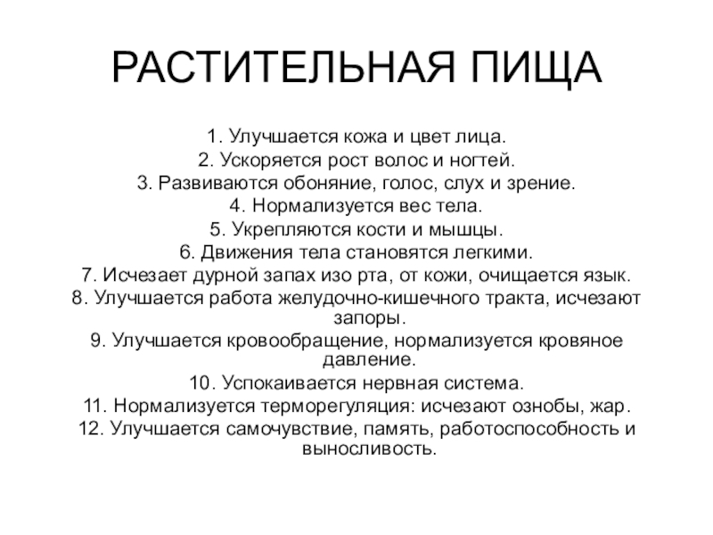 РАСТИТЕЛЬНАЯ ПИЩА1. Улучшается кожа и цвет лица.2. Ускоряется рост волос и ногтей.3. Развиваются обоняние, голос, слух и зрение.4. Нормализуется вес тела.5. Укрепляются