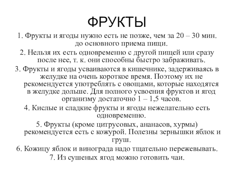ФРУКТЫ1. Фрукты и ягоды нужно есть не позже, чем за 20 – 30 мин. до основного приема пищи.2. Нельзя их