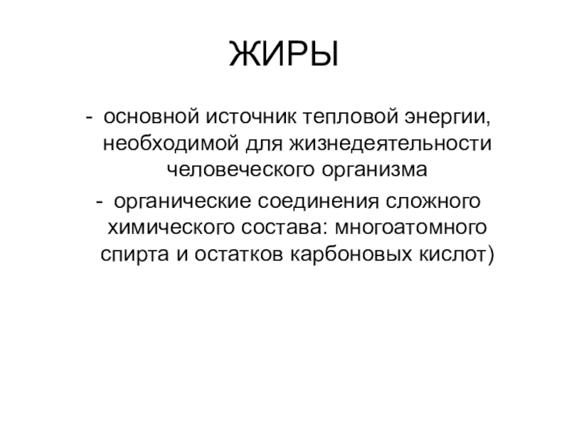 ЖИРЫосновной источник тепловой энергии, необходимой для жизнедеятельности человеческого организмаорганические соединения сложного химического состава: многоатомного спирта и остатков