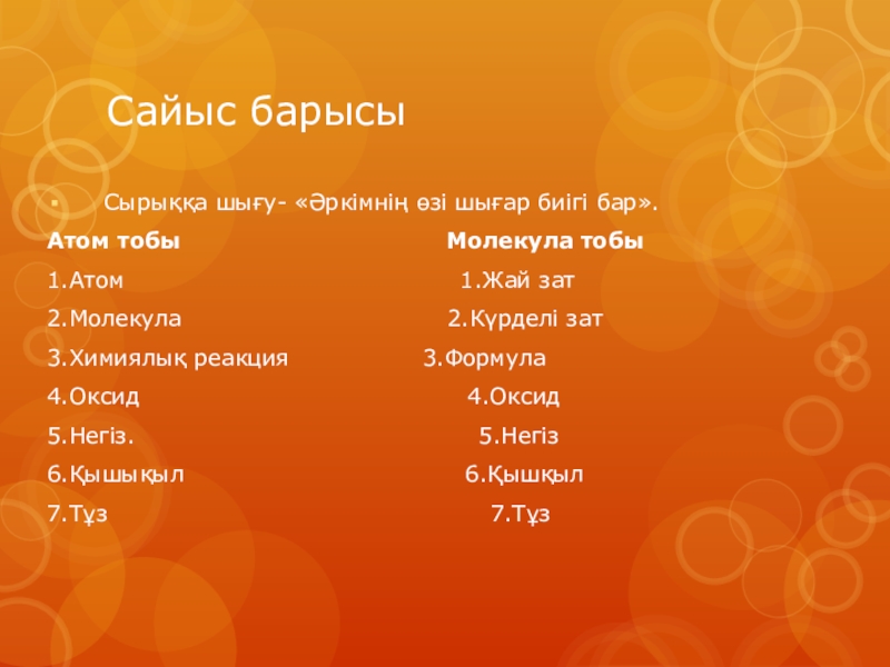 Сайыс барысы  Сырыққа шығу- «Әркімнің өзі шығар биігі бар».Атом тобы