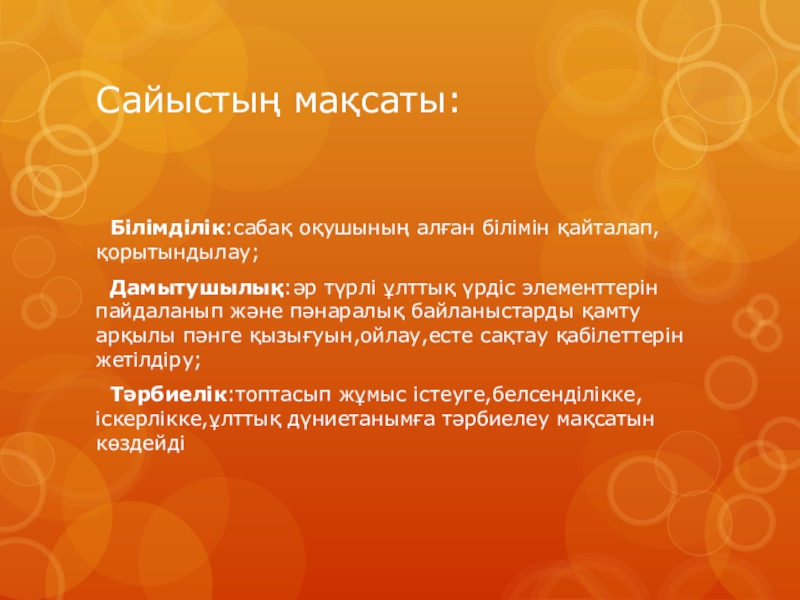 Сайыстың мақсаты: Білімділік:сабақ оқушының алған білімін қайталап,қорытындылау; Дамытушылық:әр түрлі ұлттық үрдіс элементтерін пайдаланып және пәнаралық байланыстарды қамту