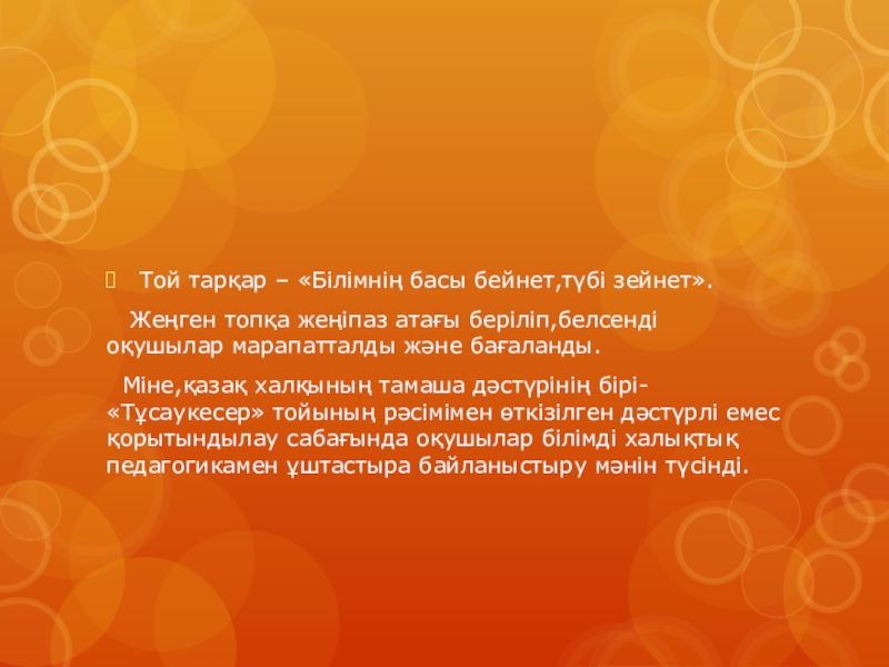 Слайд 7Той тарқар – «Білімнің басы бейнет,түбі зейнет».
