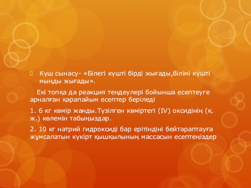 Слайд 6Күш сынасу- «Білегі күшті бірді жығады,білімі күшті мыңды жығады».