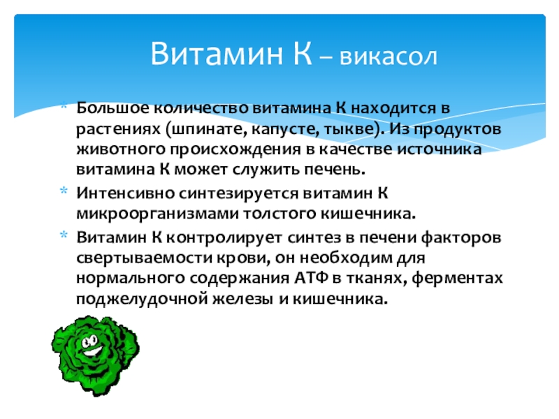 капусте, тыкве). Из продуктов животного происхождения в качестве источника витамина К может служить печень.