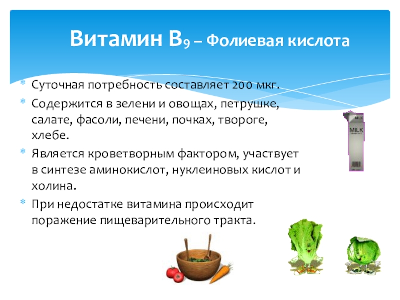 Слайд 7Витамин В9 – Фолиевая кислота