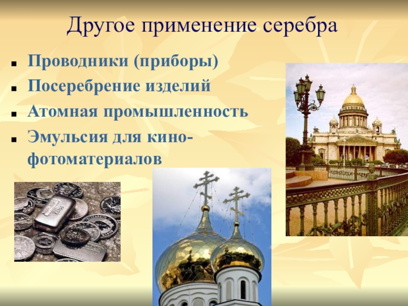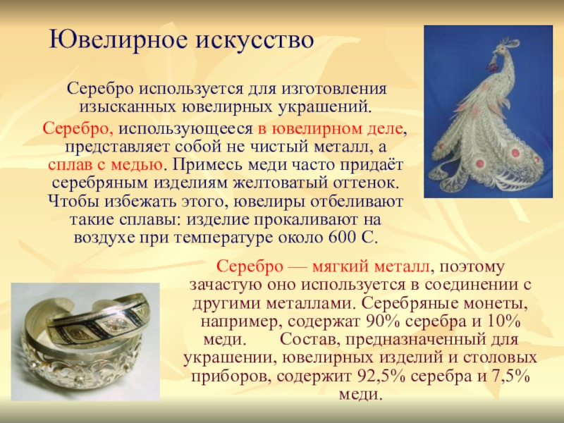 Серебро — мягкий металл, поэтому зачастую оно используется в соединении с другими металлами. Серебряные монеты, например, содержат 90% серебра и 10% меди. Состав, предназначенный для украшении, ювелирных изделий и столовых приборов, содержит 92,5% серебра и 7,5% меди.