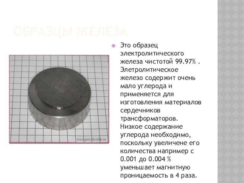 Это образец электролитического железа чистотой 99.97% . Элетролитическое железо содержит