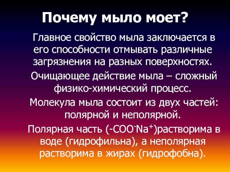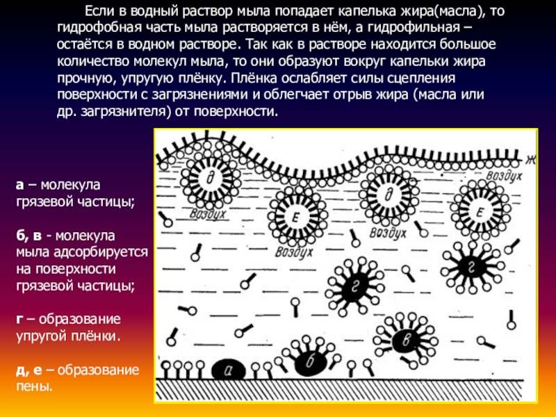 б, в - молекула мыла адсорбируется на поверхности грязевой частицы;