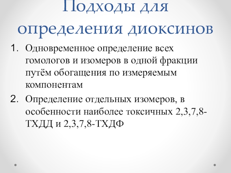 Подходы для определения диоксиновОдновременное определение всех гомологов и изомеров в одной фракции путём обогащения по измеряемым компонентамОпределение