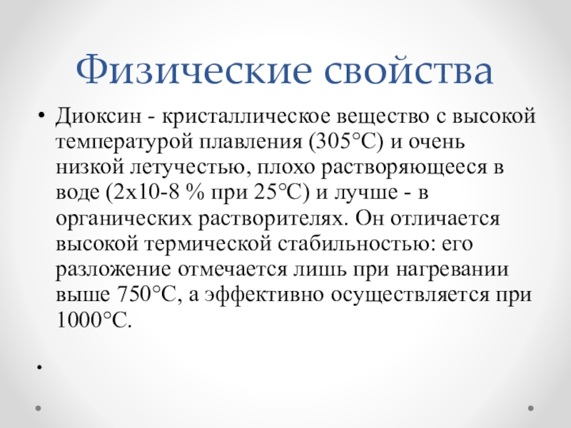 Физические свойстваДиоксин - кристаллическое вещество с высокой температурой плавления (305°С) и очень низкой летучестью, плохо растворяющееся в