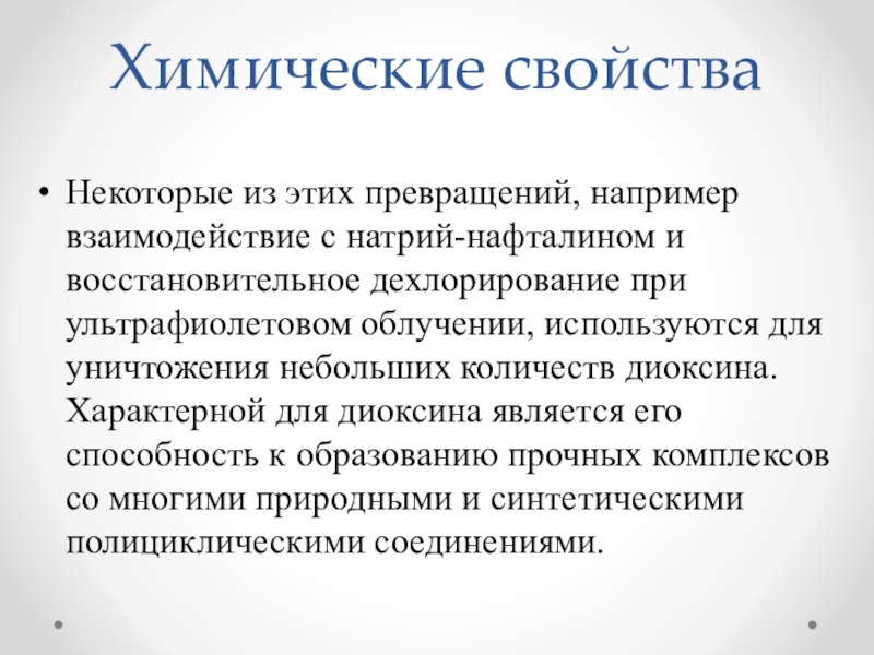 дехлорирование при ультрафиолетовом облучении, используются для уничтожения небольших количеств диоксина. Характерной для диоксина является его способность к образованию прочных комплексов со многими природными и синтетическими полициклическими соединениями.