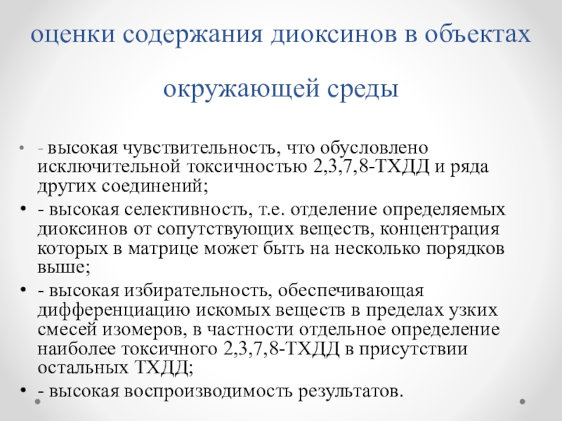 Требования к методам количественной оценки содержания диоксинов в объектах окружающей среды- высокая чувствительность, что обусловлено исключительной токсичностью