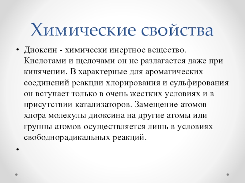 разлагается даже при кипячении. В характерные для ароматических соединений реакции хлорирования и сульфирования он вступает только в очень жестких условиях и в присутствии катализаторов. Замещение атомов хлора молекулы диоксина на другие атомы или группы атомов осуществляется лишь в условиях свободнорадикальных реакций.