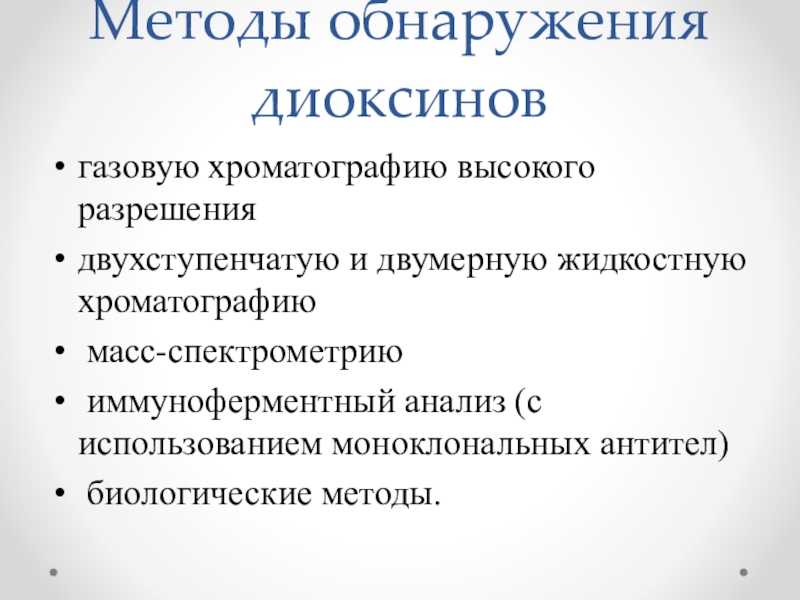 Методы обнаружения диоксиновгазовую хроматографию высокого разрешениядвухступенчатую и двумерную жидкостную хроматографию масс-спектрометрию иммуноферментный анализ (с использованием моноклональных антител)