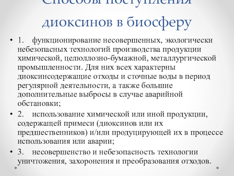 Способы поступления диоксинов в биосферу1.	функционирование несовершенных, экологически небезопасных технологий производства продукции химической, целюллозно-бумажной, металлургической промышленности. Для них