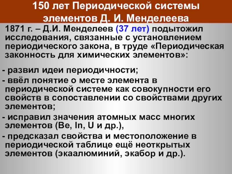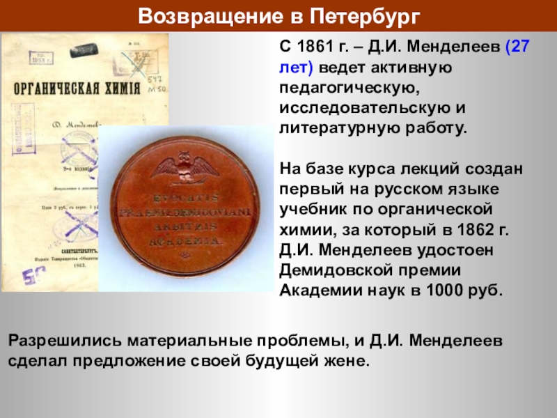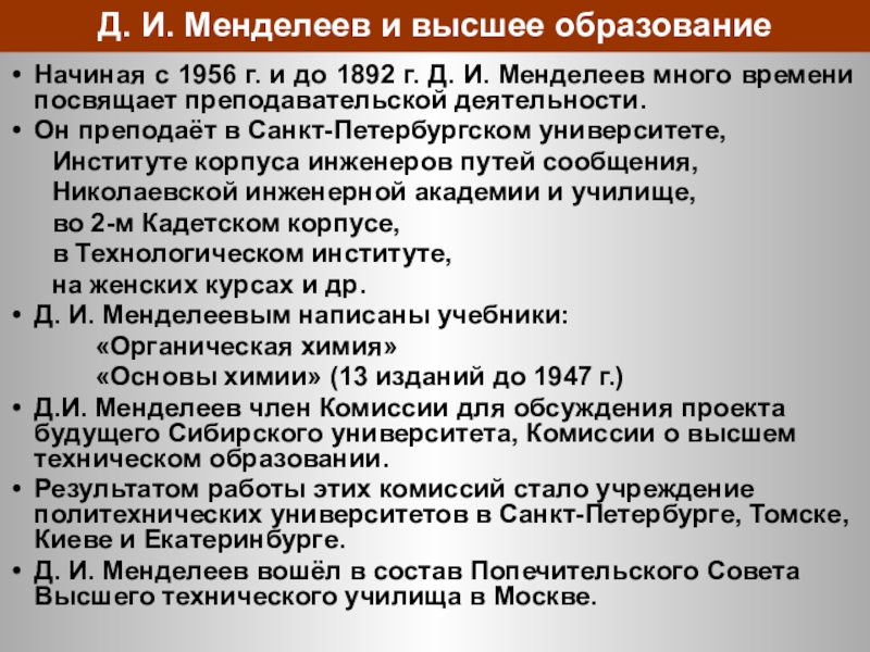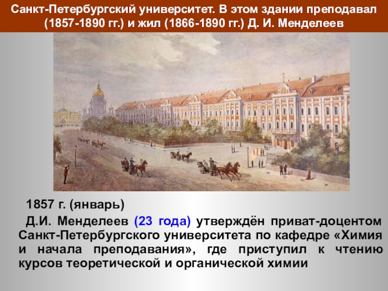 Д.И. Менделеев (23 года) утверждён приват-доцентом Санкт-Петербургского университета по кафедре «Химия и начала преподавания», где приступил к чтению курсов теоретической и органической химии