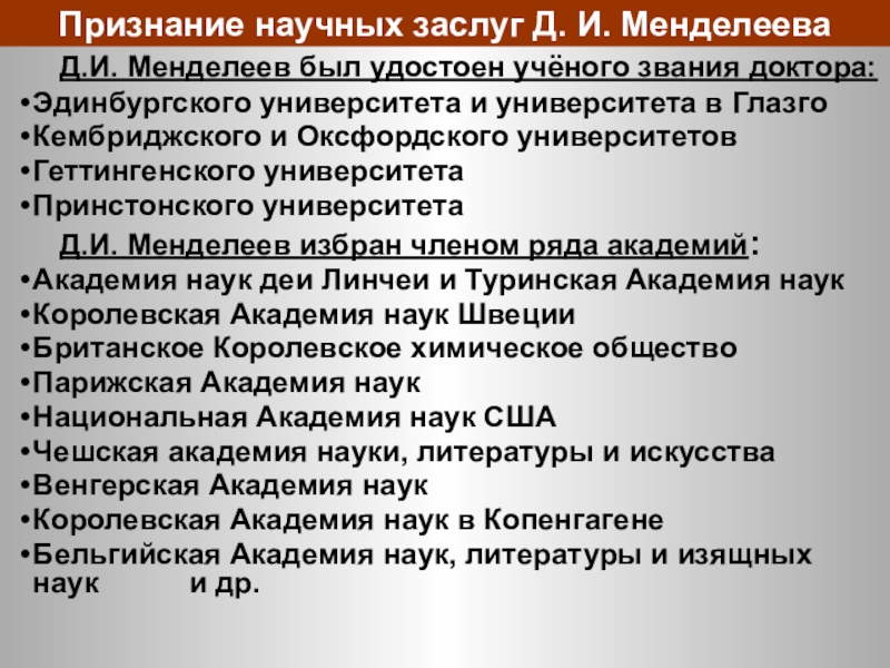 Д.И. Менделееву (50 лет) присуждено звание почетного доктора.