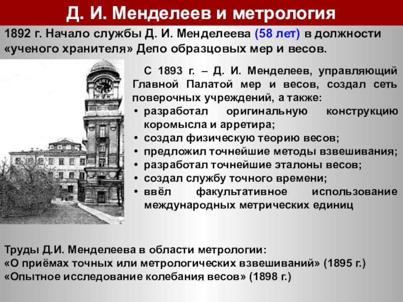 С 1893 г. – Д. И. Менделеев, управляющий Главной Палатой мер и весов, создал сеть поверочных учреждений, а также: