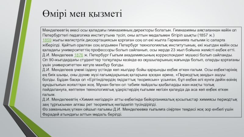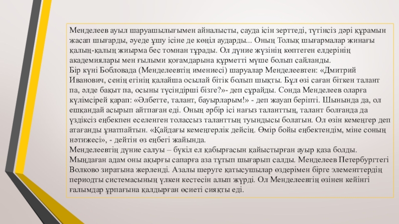 Слайд 7Менделеев ауыл шаруашылығымен айналысты, сауда ісін зерттеді, түтінсіз дәрі құрамын жасап